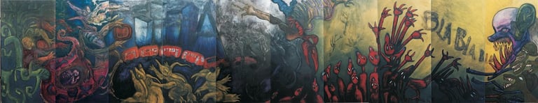 Aunque la calidad plástica de los tres murales resulta indiscutible, me llamó particularmente la atención el que firma Enrique Garnica, por la audacia con que trabajó el amplio formato y la libertad expresiva con que trató el tema seleccionado. El mural de Garnica desarrolla el tema de la convulsa realidad urbana, donde la lucha por la supervivencia se combina con la lucha por la posesión de un espacio. En esa lidia salen a flote los instintos más oscuros del hombre, los monstruos interiores que a duras penas logramos reprimir en nuestra vida cotidiana. Esos seres monstruosos son los que ha pintado Garnica con una figuración expresionista que linda con lo grotesco, y una gama de colores oscuros que amplía el dramatismo de las escenas representadas. El resultado es una obra que aborda la sociedad de una manera crítica y que evita cualquier tipo de coqueteo con lo decorativo y lo banal.
